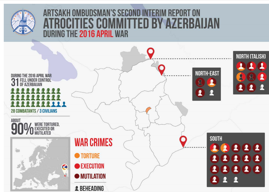 On 9 December 2016, the Ombudsman of Nagorno Karabakh has published a new report on atrocities committed by Azerbaijani forces during April 2-5, 2016 against the civilian population and soldiers of Nagorno Karabakh. According to Mr. Ruben Melikyan, Ombudsman of Nagorno Karabakh, the findings of the present report are alarming for the international community, in particular the international human rights community. The systemic and grave violations of the International Humanitarian Law in April 2016 by the Azerbaijani armed forces still require proper actions from the respective international human rights organizations, as a matter of concern for the whole international community.
